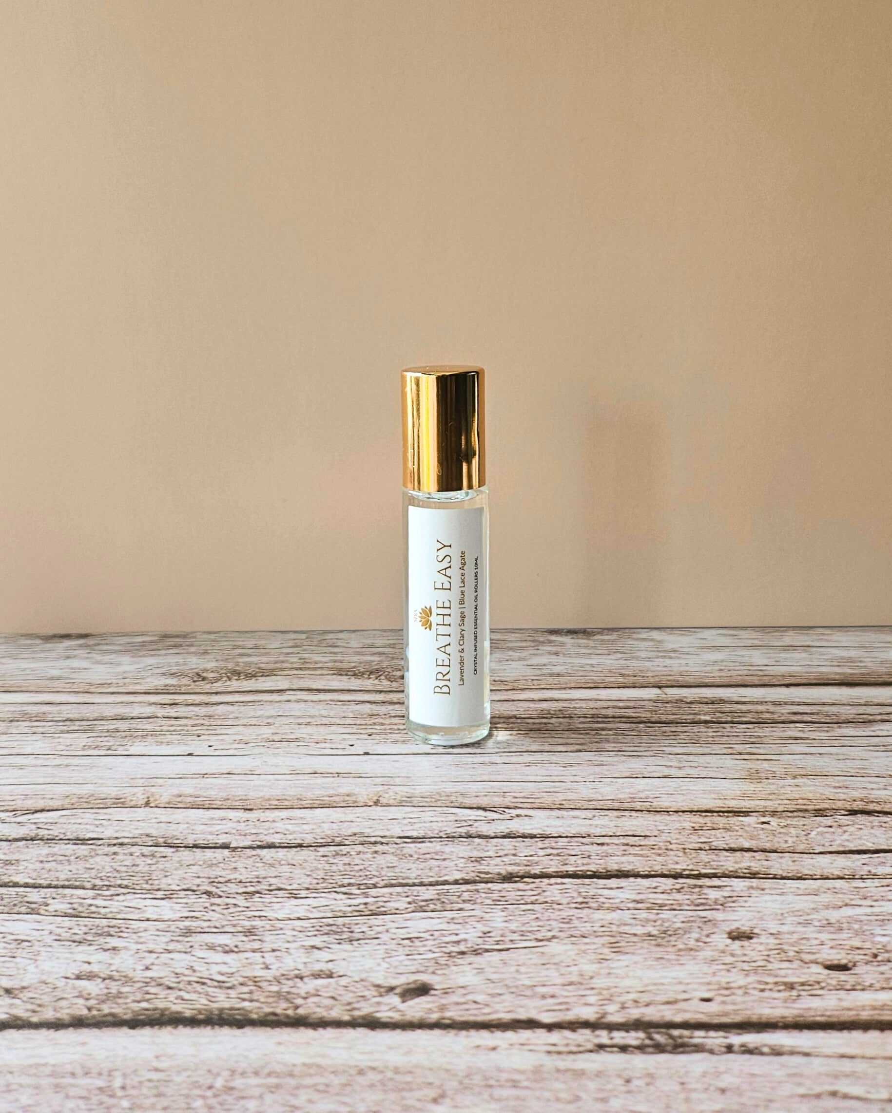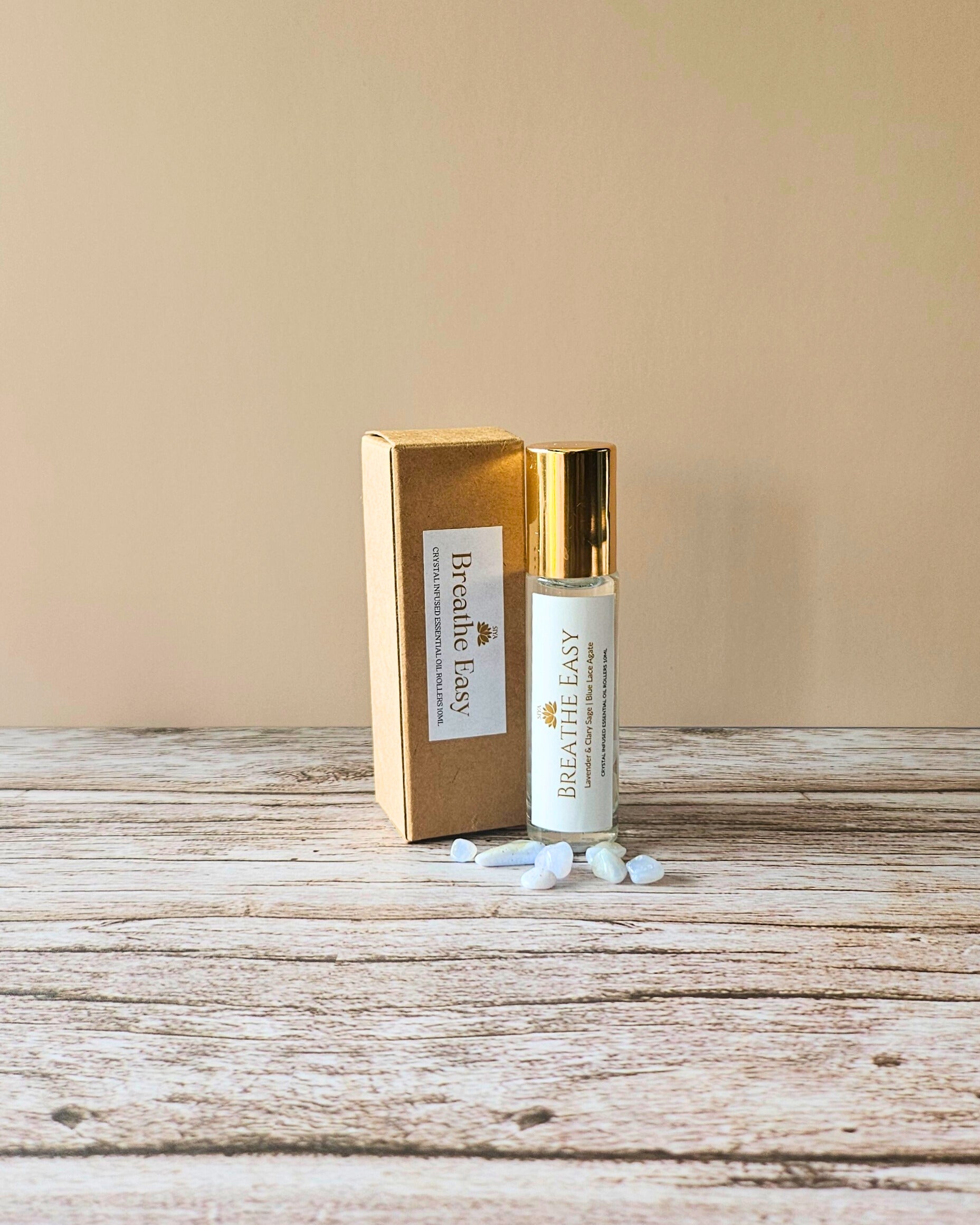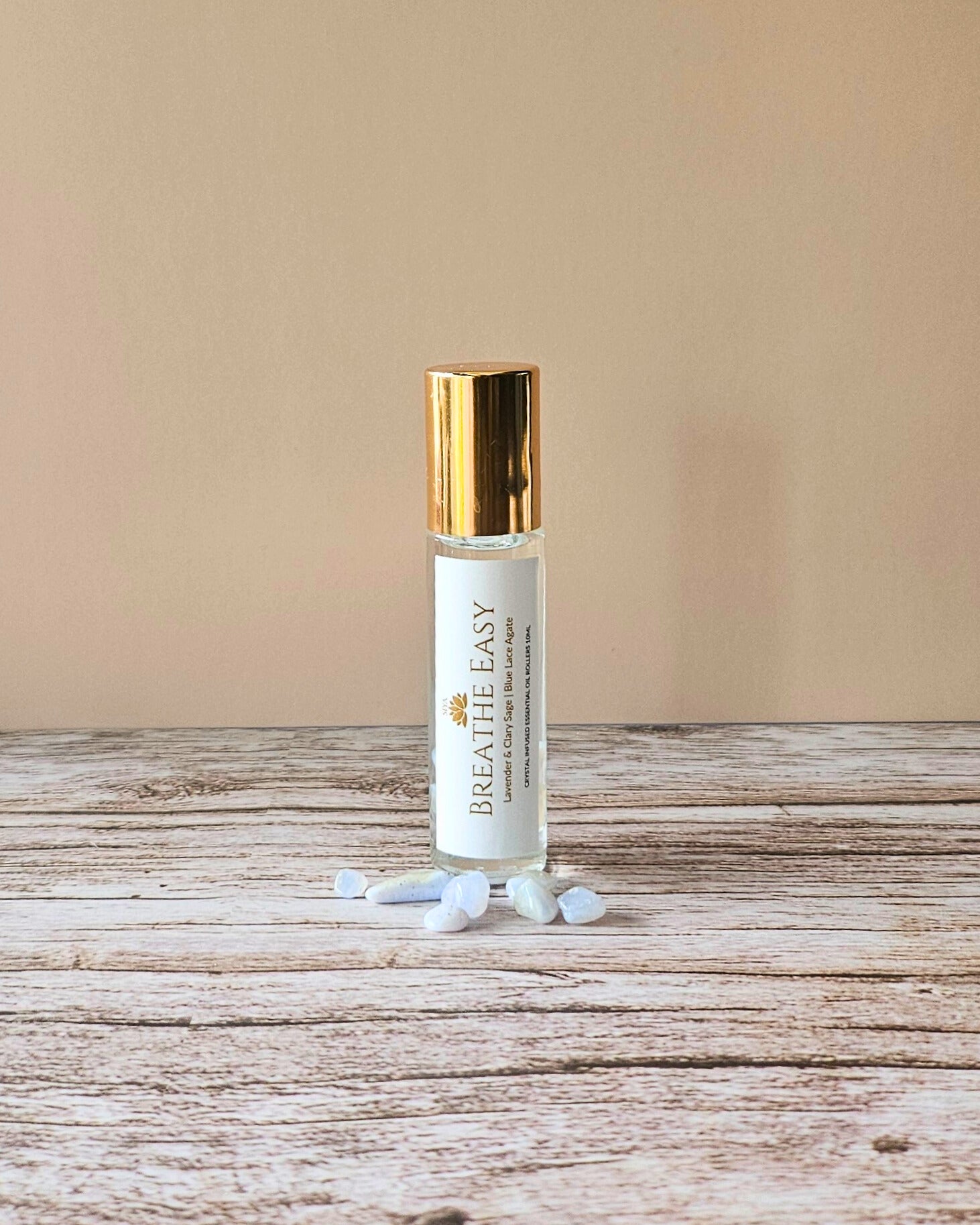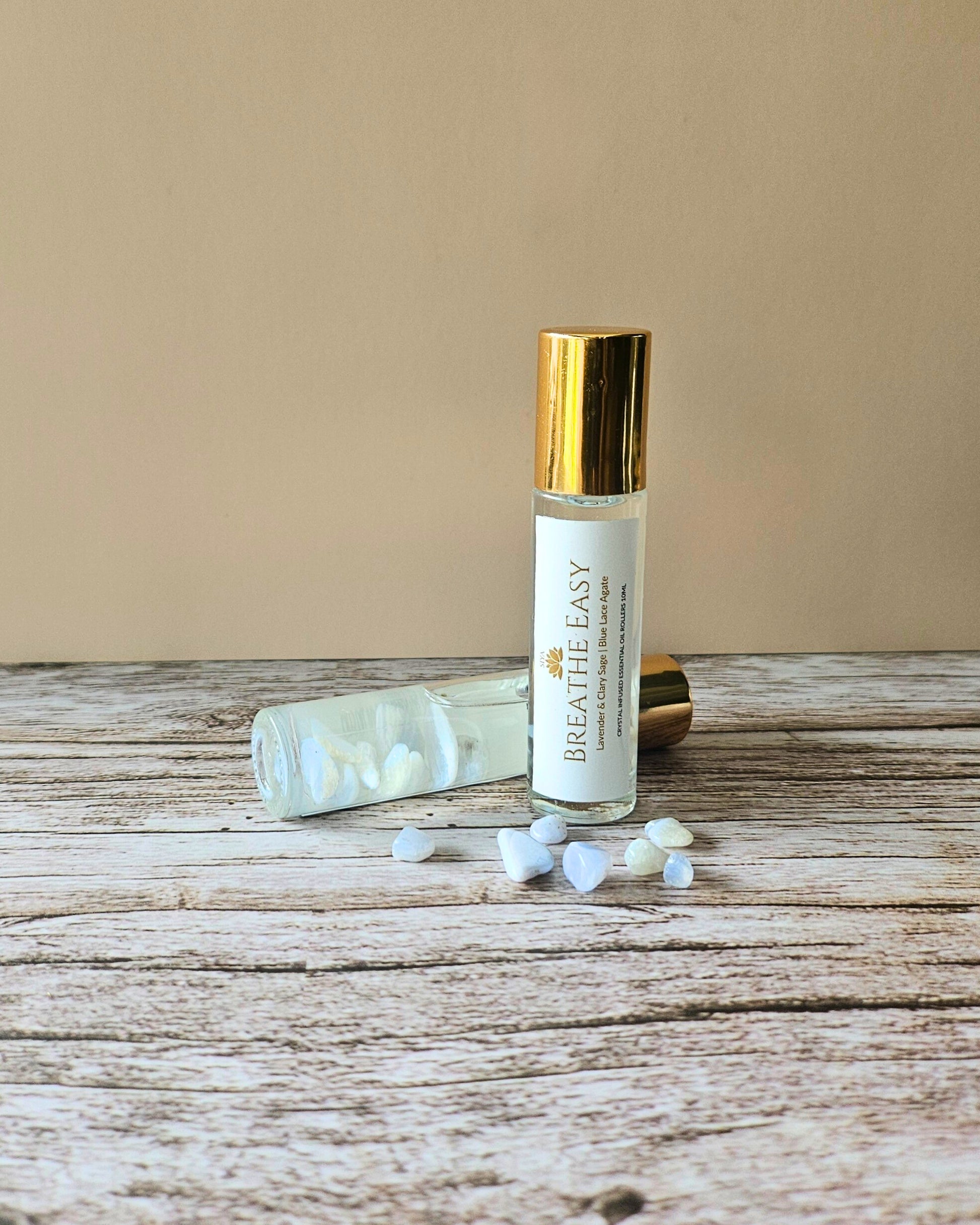 Meet your new moment of clarity. The Breathe Easy Essential Roll-On blends the soothing calm of lavender with the grounding herbal lift of clary sage, all infused with the tranquil, soft-blue energy of blue lace agate.