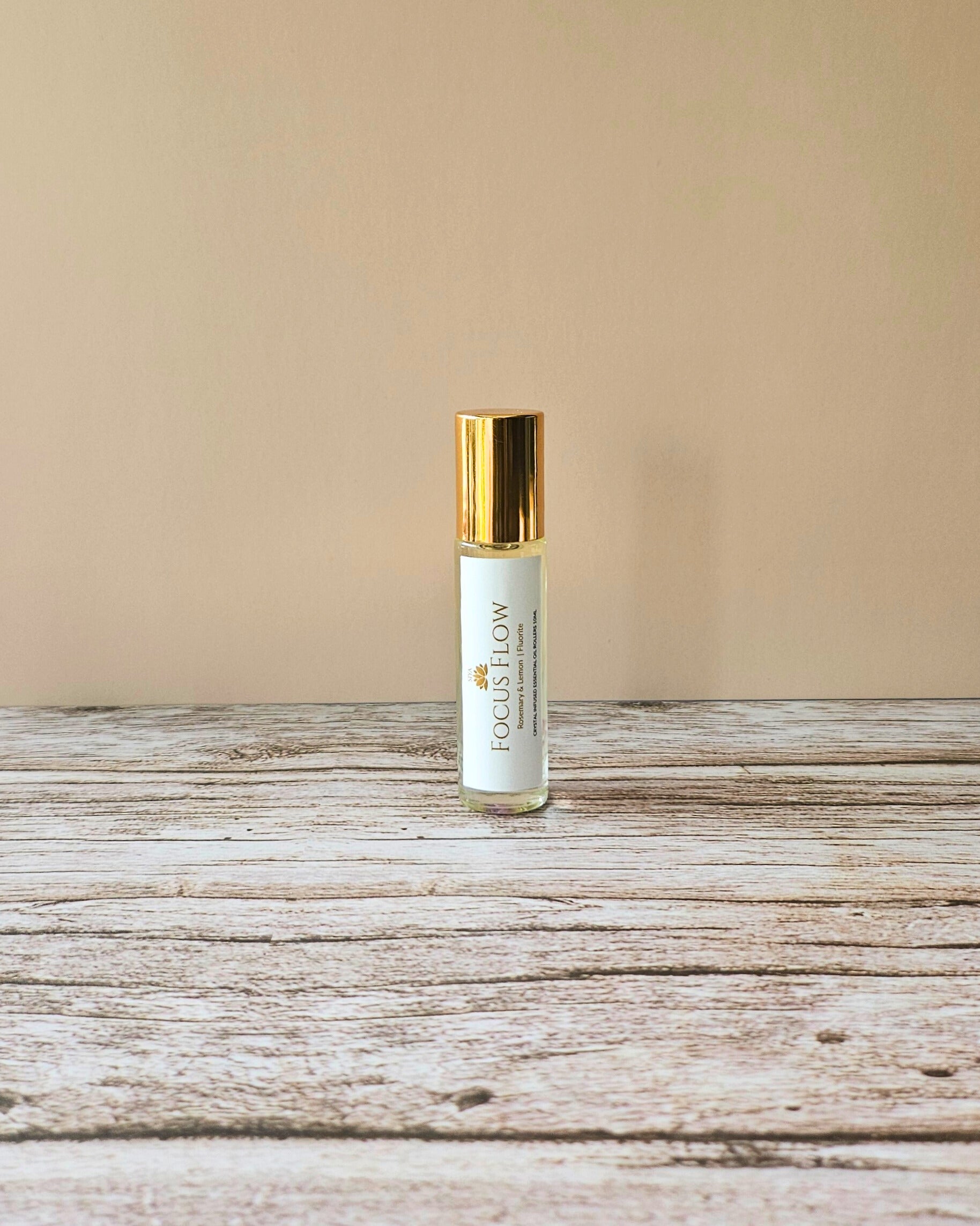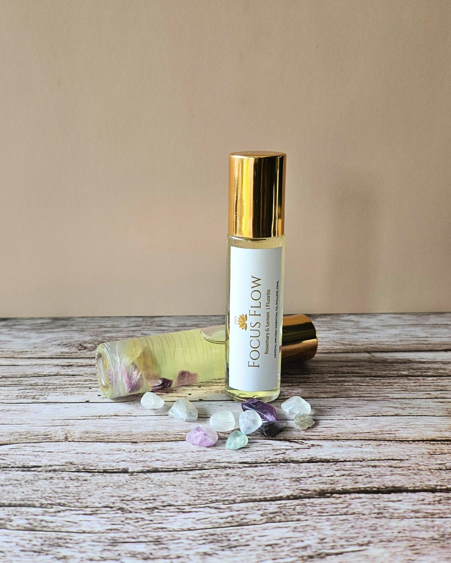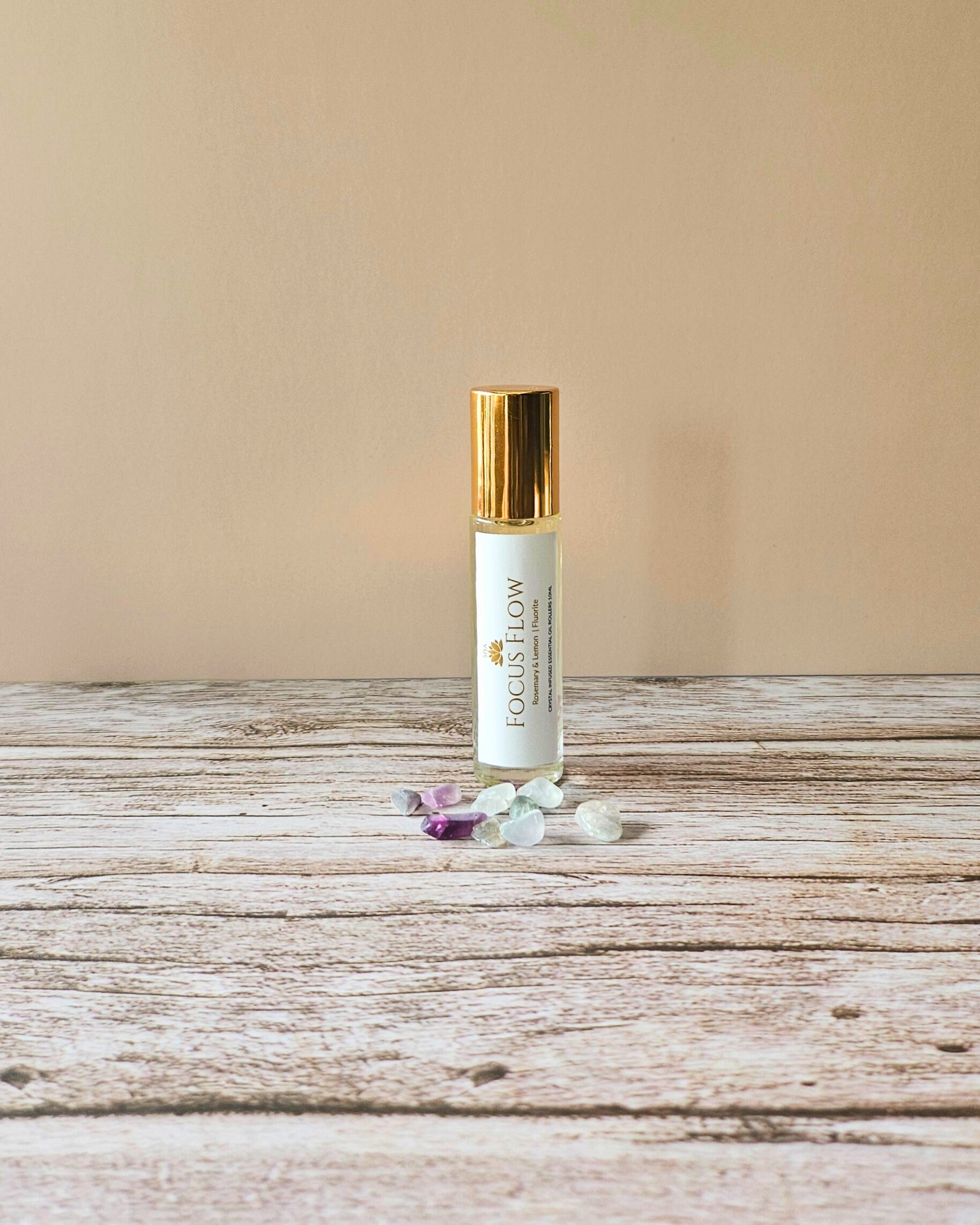 Meet your new clarity booster. The Focus Flow Essential Roll-On blends the invigorating freshness of rosemary with the bright, uplifting energy of lemon, all infused with the focus-enhancing, stabilizing energy of fluorite.