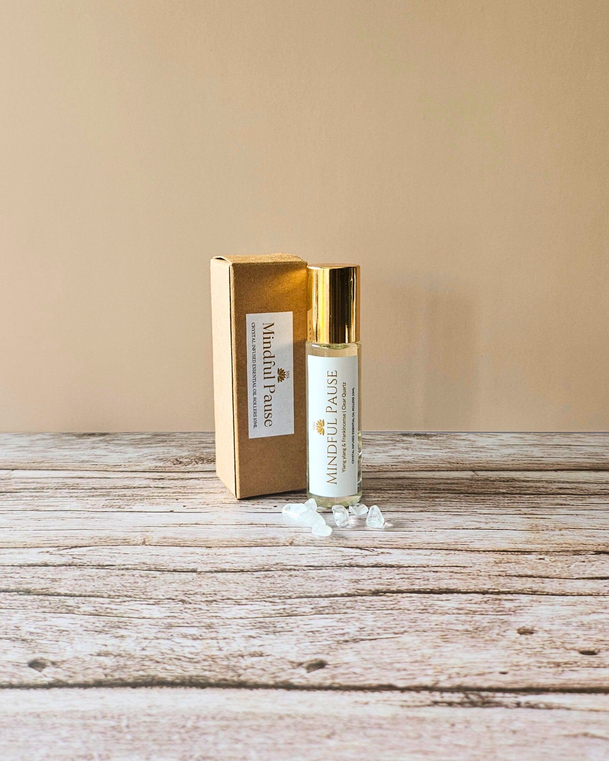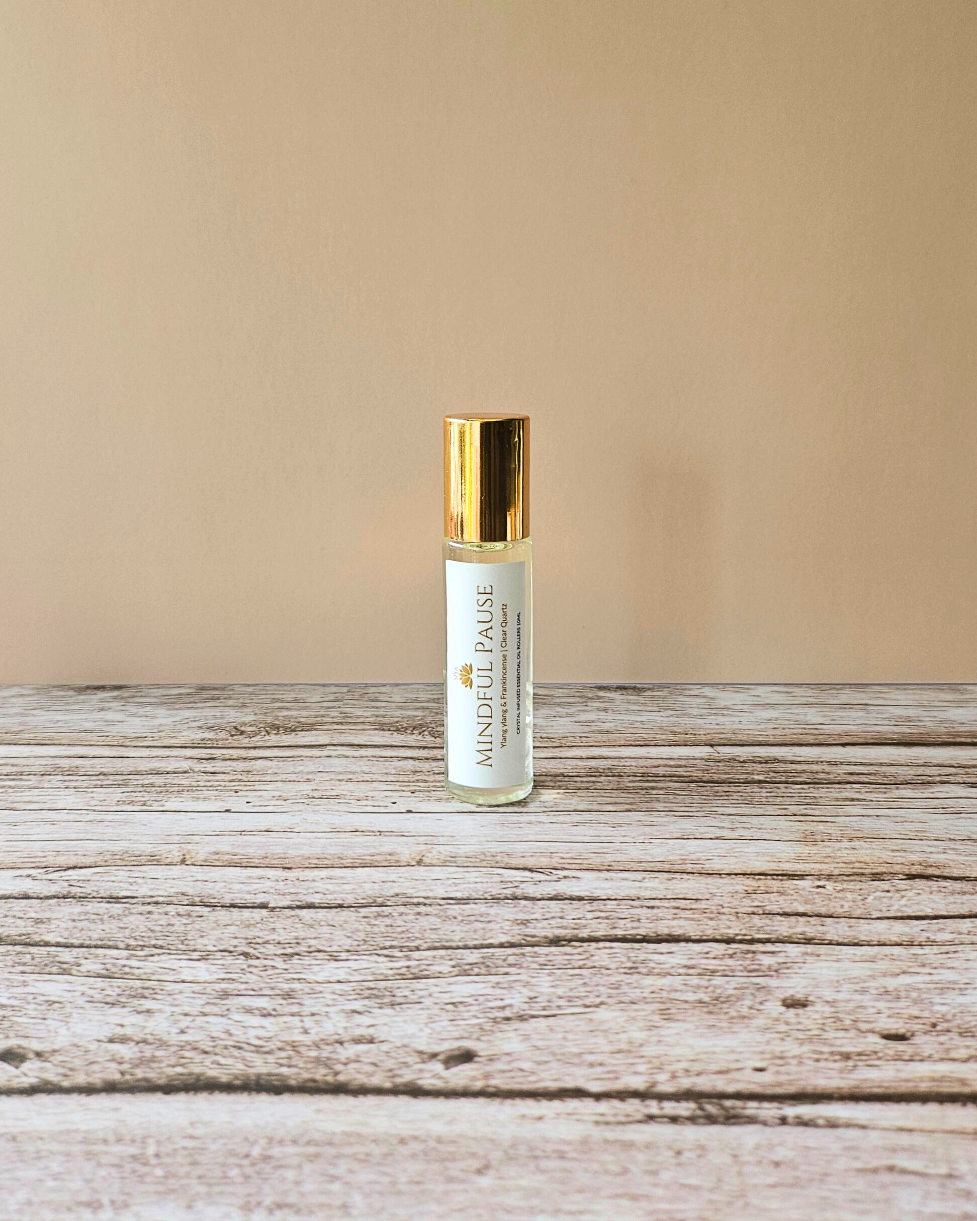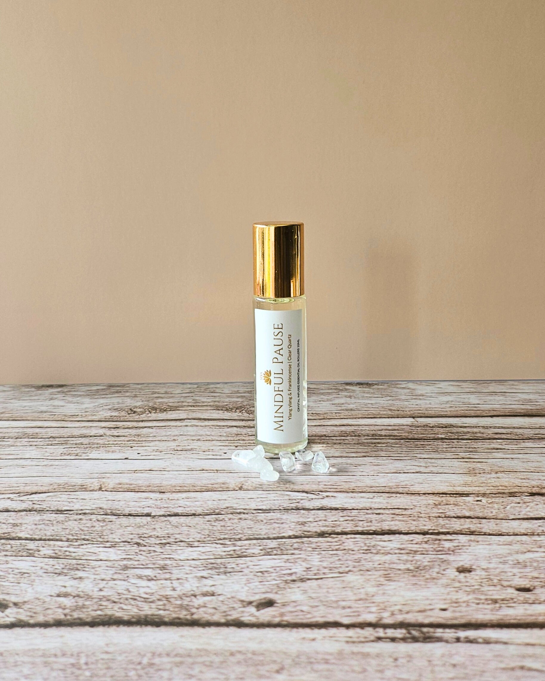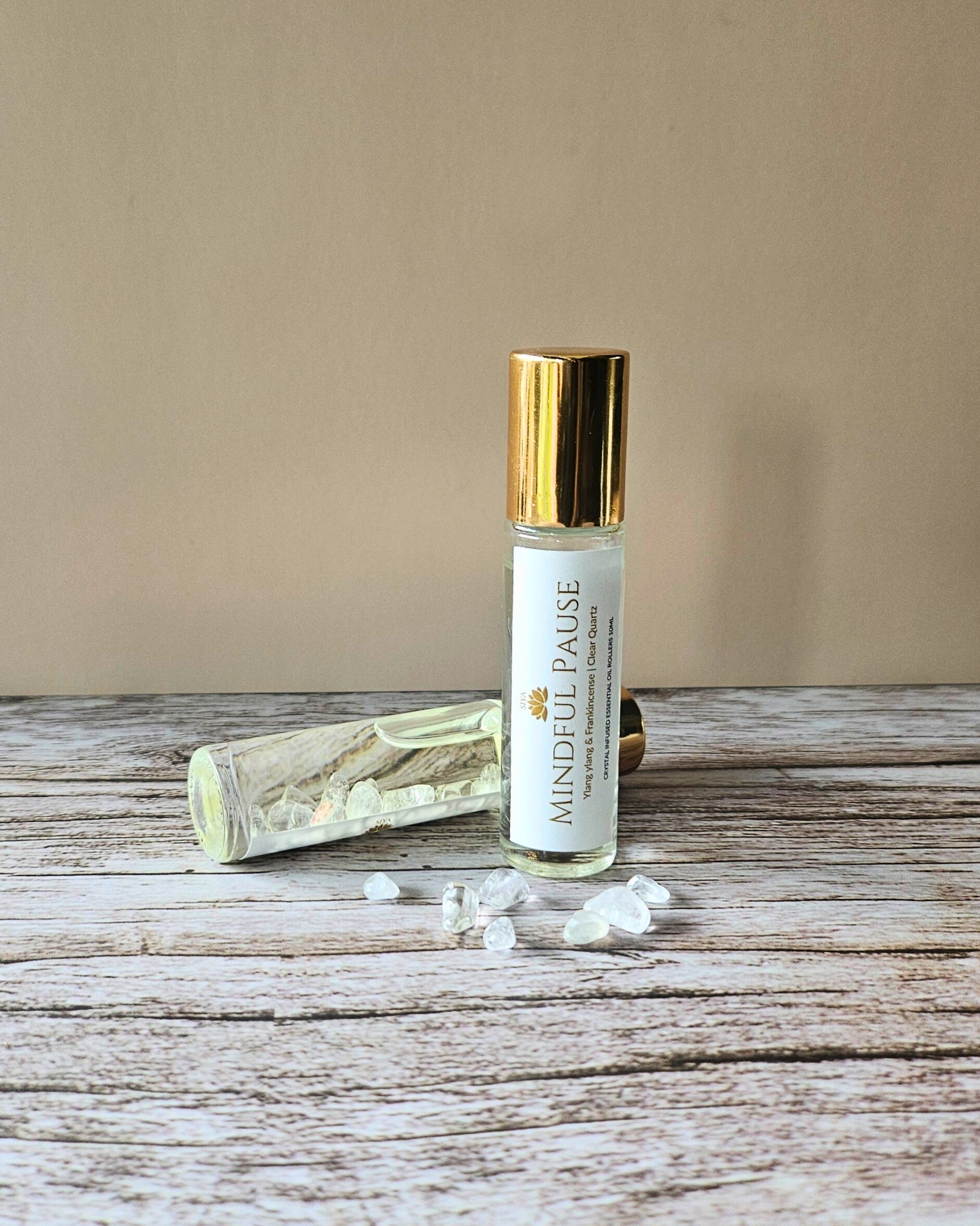 The Mindful Pause Essential Roll-On blends the rich, floral serenity of Ylang Ylang with the grounding depth of frankincense, all infused with the clarifying, light-reflective energy of clear quartz.